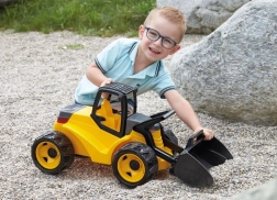 Dieser robuste gelb-schwarze Lader bringt realistischen Spielspaß auf jede Kinderbaustelle. Dank der funktionalen Frontschaufel können Kinder Sand, Erde oder Bausteine aufnehmen und ihre Bewegungskoordination trainieren. Die widerstandsfähige Ausführung eignet sich auch für das Spielen draußen im Garten oder im Sand.