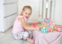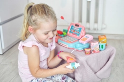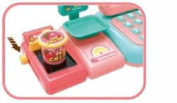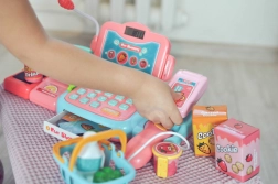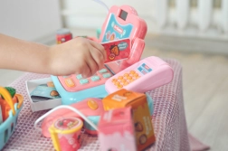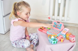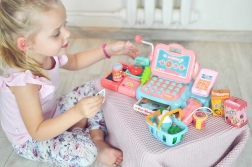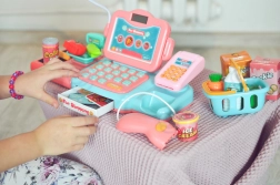 Die funktionale Tastatur, die Geldschublade und das Terminal ermöglichen es Kindern, Preise einzugeben und die Zahlung bar oder mit Karte auszuwählen.