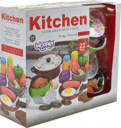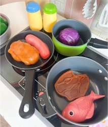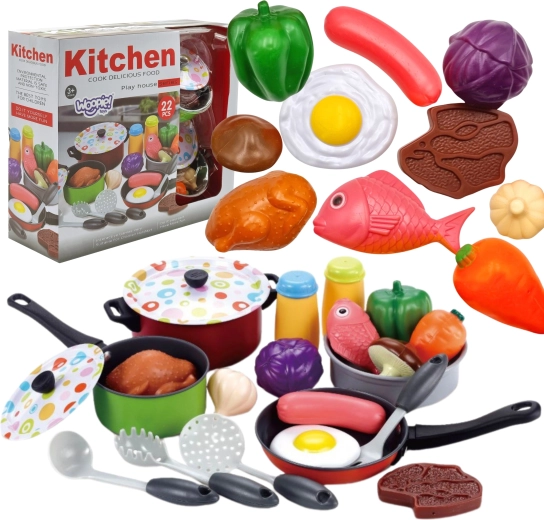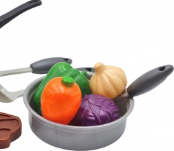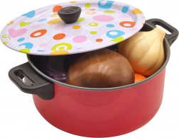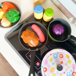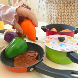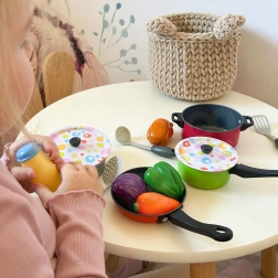 Töpfe mit Deckeln, eine Pfanne und bunte Zutaten ermöglichen Kindern, echtes Kochen nachzuahmen und dabei Fantasie sowie Feinmotorik zu fördern.