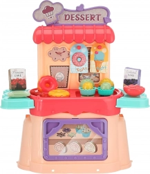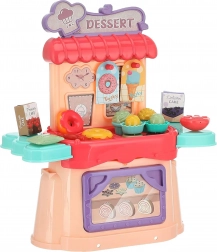 Dabei sind Eis, Donuts, Süßigkeiten, Schälchen, Schachteln und weiteres Zubehör für ein realistisches Spiel von Laden und Konditorei.