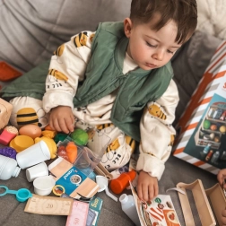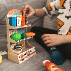 Das Kaufladenspiel fördert selbstständiges Denken, Kommunikation und kreatives Spiel. Dank 42 Elementen – von Obst und Gemüse bis hin zu Getränken und Konserven – können Kinder eigene Szenarien erschaffen und Alltagssituationen üben.