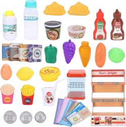 Das Set enthält Obst, Gemüse, Getränke, Konserven, Scheine und Münzen – alles für viele Stunden kreativen Kaufladenspiels.