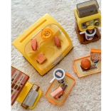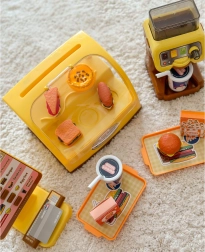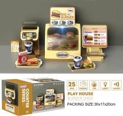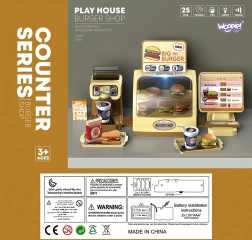 Das Set enthält 25 Teile, darunter Hamburger, Pommes, Sandwiches, Becher mit Strohhalmen, Tabletts, Menübildschirm sowie einen Getränkespender, den man mit Wasser füllen kann, um wirklich in die Becher „einzuschenken“. Buntes Kunststoffzubehör ist leicht und ideal für Rollenspiele – Bedienung, Koch und Kassierer.