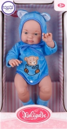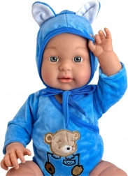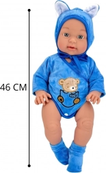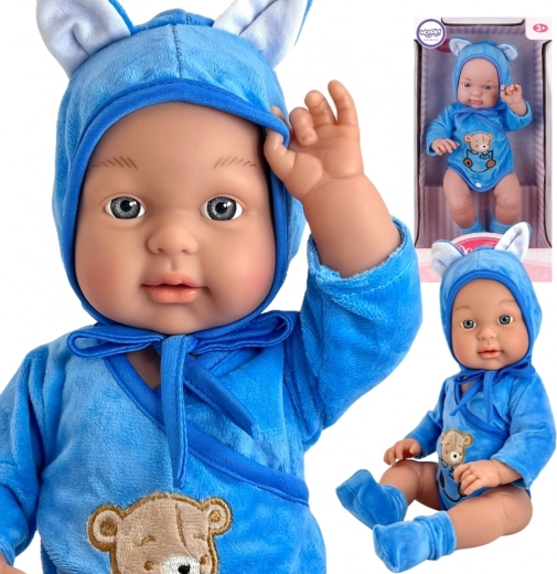 Liebevoll gestaltetes Gesicht, Hände und Füße in Kombination mit dem weichen, blauen Outfit mit Bärenmotiv sorgen für einen authentischen und niedlichen Look.