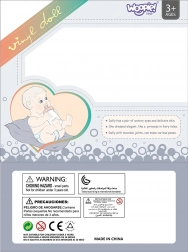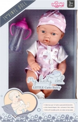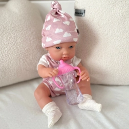 Die Puppe hat weiche Gummi-Arme und -Beine sowie einen festen Kunststoffkörper ohne Plüschfüllung, was Robustheit und einfache Pflege gewährleistet. Im Set ist außerdem ein rosa Fläschchen enthalten, das die Puppe in den Händen halten kann – perfekt für das Fütter-Spiel.