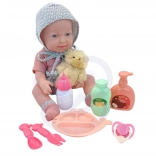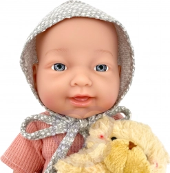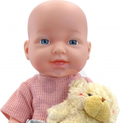 Das Set bietet alles, was kleine Pflegeprofis brauchen: eine angezogene Puppe, einen Schnuller, einen Teddybären, ein Fläschchen und ein Ess-Set (Teller, Gabel, Löffel), ergänzt durch zwei Fläschchen „Kosmetik“ für Bade- und Pflegeszenarien. Die Puppe besitzt weiche, gummiartige bewegliche Gliedmaßen und einen Kunststoffkörper ohne Plüschfüllung.