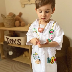 Dieses präzise verarbeitete Arztkostüm von Woopie bietet kleinen Medizinliebhabern die perfekte Ausrüstung für ihre fantasievollen Spiele. Es enthält bunte Drucke von Werkzeugen wie einem Stethoskop, Medikamenten und einem Thermometer. Dank der geräumigen Taschen ist es ideal zum Aufbewahren weiterer Spielutensilien.