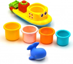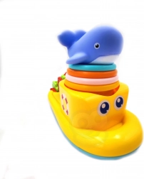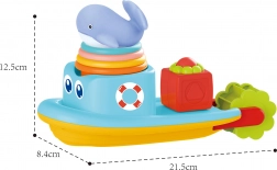 Dieses farbenfrohe Badeset bringt Kindern ab 12 Monaten jede Menge interaktive Unterhaltung. Das schwimmende Boot ist mit einem drehbaren Wasserrad ausgestattet, das sich durch den Wasserstrom dreht und Kinder die Prinzipien von Ursache und Wirkung verstehen lässt. Der weiche Gummiwal quietscht beim Drücken, regt die Sinneswahrnehmung an und unterstützt das Spiel in einer angenehmen, sicheren Umgebung.