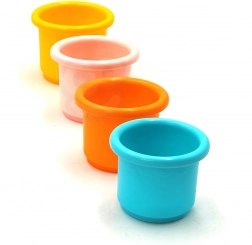 Vier farbige Becher haben am Boden unterschiedliche Öffnungen, sodass beim Umgießen verschiedene Wassereffekte entstehen. Kinder lernen so spielerisch Farben zu unterscheiden, trainieren die Hand-Auge-Koordination und stärken ihre Kreativität. Robuste, glatte Materialien fühlen sich angenehm an und lassen sich leicht reinigen.