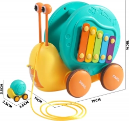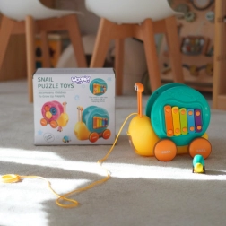 Diese multifunktionale Schnecke von WOOPIE begeistert Kinder auf den ersten Blick. Das bunte Gehäuse dient als Xylophon mit Klangstäben, auf die man mit den herausnehmbaren „Augen“ – den Schlägeln – klopfen kann. Dank der festen Schnur können Kinder die Schnecke ziehen oder anschieben und so Hand-Auge-Koordination und Balance fördern. Auf dem Rücken befindet sich ein Knopf, der die Abschussbahn öffnet für das kleine Auto-Schneckchen und für viele fröhliche Momente sorgt.