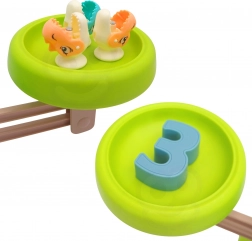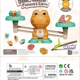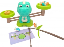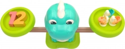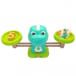 Die Zahlengewichte 1–10 entsprechen der Anzahl der Dino-Figuren. Kinder sehen, wann die Waage im Gleichgewicht ist, und verstehen intuitiv das Addieren und Subtrahieren.