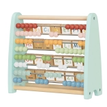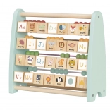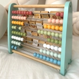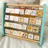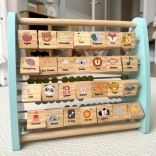 Eine Seite enthält ein klassisches Rechenbrett mit Perlen zum Zählen, die andere Seite hat drehbare Blöcke mit Buchstaben und Bildern für interaktives Lernen.