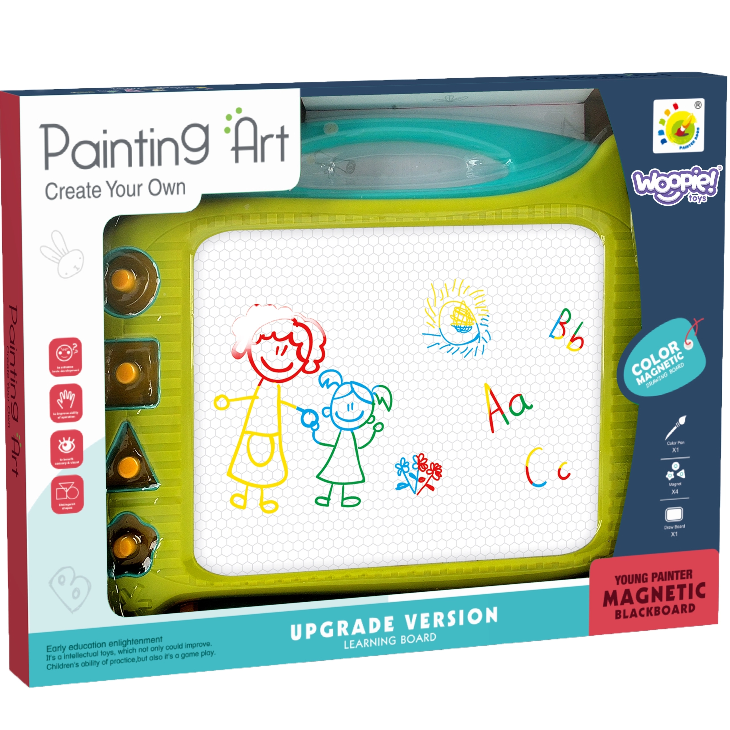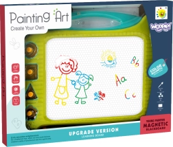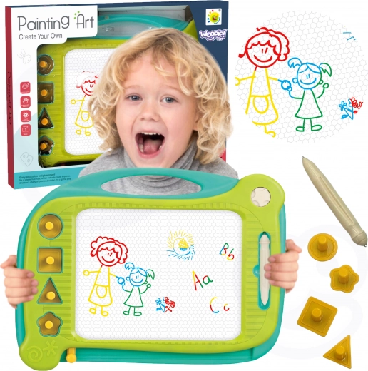 Die magnetische Zeichentafel WOOPIE bietet lange Zeit Kreativität und Spaß! Diese Tafel ermutigt zum Schreiben und Zeichnen. Durch das Zeichnen kann sich Ihr Kind konzentrieren und entspannen. Die Tafel ermöglicht unendlich viele Bilder – einfach mit dem speziellen Schieberegler wischen und die Zeichnung verschwindet, sodass Sie wieder von vorne beginnen können! Das Set enthält außerdem einen Zauberstift und 4 Stempel für Abwechslung. Die Tafel hat einen praktischen Griff für einfaches Tragen, sodass Ihr Kind sie überallhin mitnehmen kann. Dieses Produkt fördert die Entwicklung manueller Fähigkeiten, Vorstellungskraft und Kreativität und hilft, die künstlerische Ader der Kinder zu entfalten!