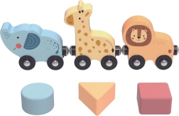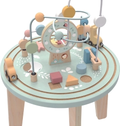Dieser hochwertige Holztisch eröffnet Kindern eine bunte Welt der Formen und Farben. Das zweispurige Motoriklabor trainiert die Fingerfertigkeit, die Formensteckbox lehrt das Erkennen von Formen und Farben, Zahnräder fördern Logik und Ursache-Wirkungs-Zusammenhänge, und der Zug mit niedlichen Tieren fährt seine Runde um den Tisch.