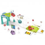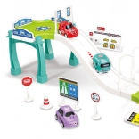 Im Set enthalten sind Parkplatz/Strecke, Verkehrsschilder, Tankstelle und drei Autos mit verschiedenen Motiven (zufällige Auswahl).