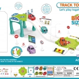 Diese Rennstrecke und Parkgarage von WOOPIE ist so konzipiert, dass sie jeden kleinen Fahrer begeistert. Sie enthält drei Autos, mit denen Kinder auf steilen Abhängen fahren und auf verschiedenen Ebenen parken oder an der Tankstelle auftanken können.