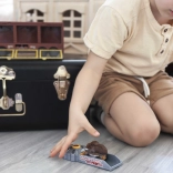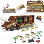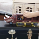 Das Set enthält auch eine Fülle von Zubehör wie Dinosaurier, Bäume und Steine. Der Lkw ist mit Licht- und Soundeffekten ausgestattet, die durch drei Knöpfe aktiviert werden. Jeder Knopf löst einen anderen Klang oder eine Melodie aus und das Licht im Inneren des Anhängers geht an.