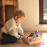 Knöpfe, Hebel, Drehknäufe und ein Gurtaufzug bestimmen Strecke und Geschwindigkeit. Die rein mechanische Lösung sorgt für Zuverlässigkeit und fördert Feinmotorik sowie logisches Denken.
