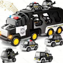 Das große Polizei-Set der Marke Woopie bietet 5-in-1-Spielspaß: einen riesigen Transport-Sattelschlepper und vier Polizeifahrzeuge (gepanzertes Fahrzeug, Wasserwerfer-Tankwagen, Helikopter, Funkwagen). Einfach die Taste in der Kabine drücken und blinkende Lichter und realistische Sirenen starten. Robuste Konstruktion, interaktive Effekte und bewegliche Elemente fördern Kreativität und Fantasie von Kindern ab 3 Jahren.