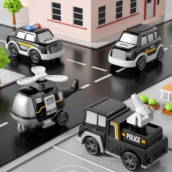 Großer Transport-Sattelschlepper, gepanzertes Fahrzeug, Wasserwerfer-Tankwagen, Helikopter und Funkwagen – kombinieren und eigene Polizeimissionen gestalten.