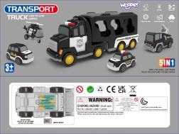 - Transport-Sattelschlepper (Autotransporter) + 4 Polizeifahrzeuge: gepanzertes Fahrzeug, Wasserwerfer-Tankwagen, Helikopter, Funkwagen