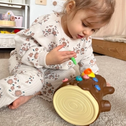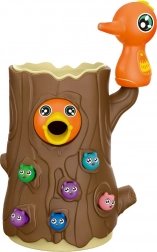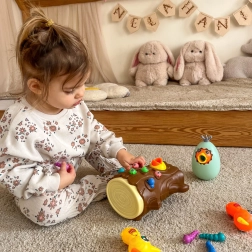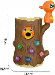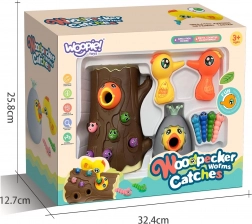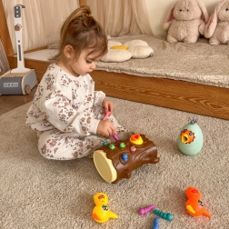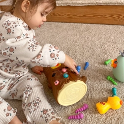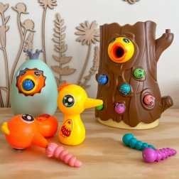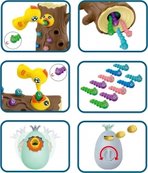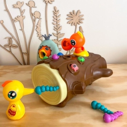 Das Spiel besteht darin, ein hungriges Küken mit Würmern zu füttern, die im Baumstamm versteckt sind. Das Kind benutzt die magnetischen Spechte-Schnäbel, um die Würmer zu „fangen“ und sie zum Küken zu bringen. Der Spaß erfordert Genauigkeit und Konzentration, sodass Kinder ihre manuelle Geschicklichkeit üben und dabei viel Freude haben. Nach Spielende können die Würmer aus dem Stamm ausgeschüttet und alles für die nächste Runde vorbereitet werden.