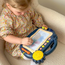 Die magnetische Fläche lässt sich mit dem Schieberegler mühelos säubern. Mit vier Stempeln und dem beiliegenden Stylus erschafft das Kind immer wieder neue Bilder – ganz ohne Papier und ohne Unordnung.