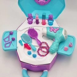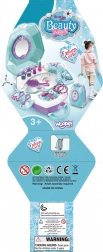 Inbegriffen ist ein realistischer batteriebetriebener Föhn, der tatsächlich Luft bläst, sowie zahlreiche Accessoires für Rollenspiele rund ums Schminken und Frisieren. Kinder entwickeln spielerisch Fantasie, Feinmotorik und soziale Fähigkeiten beim Spiel im Beauty-Salon.