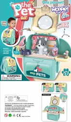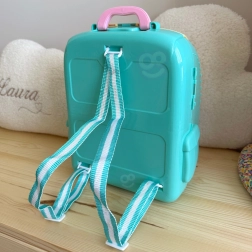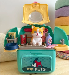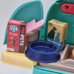 Entdecke das kompakte 2-in-1-Set – einen niedlichen Rucksack/Transporter mit Sichtfenster und einen vollständigen mini Pflegesalon für Haustiere im Inneren. Kinder können das Kätzchen im Becken mit Wasserhahn baden, kämmen, schneiden und danach aus den Näpfen füttern. Verriegelbare Türen und ein abnehmbarer Gurt sorgen für bequemes und sicheres Tragen.