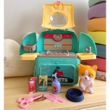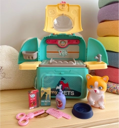 Kätzchenfigur, Näpfe, Schere, Kamm, „Shampoo“, Zubehörkörbchen, Futterdöschen und mehr. Alles hat seinen Platz – Aufräumen wird zum Kinderspiel.