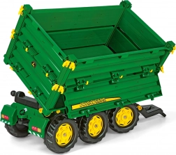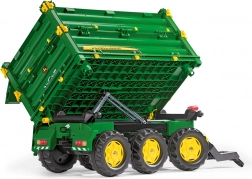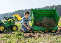 Dieser realistische Anhänger in den Farben von JOHN DEERE verwandelt jeden Garten in einen kleinen Bauernhof. Dank 3-seitigem Kippen und öffnenden Bordwänden überzeugt er Kinder durch seine Funktionalität und erleichtert das Beladen und Entladen von Gras, Sand oder Kleinteilen. Das drehbare Andruckrädchen/Bedienknopf ermöglicht eine einfache und sichere Bedienung des Kippmechanismus.