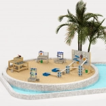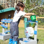 Die robuste Konstruktion aus widerstandsfähigen Materialien mit ungiftiger Oberflächenbehandlung ist für den Außenbereich geeignet. Kinder lernen spielerisch das Prinzip Ursache–Wirkung: Ich gieße Wasser ein – das Rad beginnt sich zu drehen. Die Wasserstation ist ideal zum Spielen am Sandkasten, im Garten und in Kindergärten.