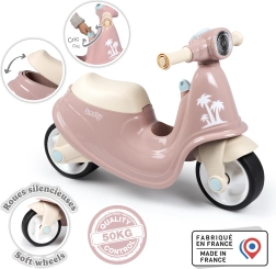 Rosa Roller der renommierten Marke Smoby ist ein niedliches Retro-Fahrzeug auf zwei Rädern, ideal für kleine Kinder. Es ist ein entwicklungsspielzeug, das Gleichgewicht, Kraft und Kondition des Kindes unterstützt.