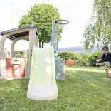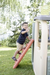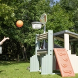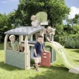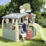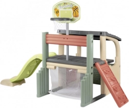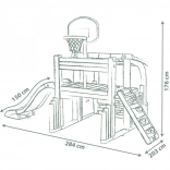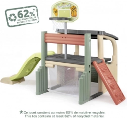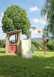 Das multifunktionale SMOBY Spielcenter verbindet Sport, kreatives Spiel und Entspannung. Kinder können auf den Basketballkorb werfen, die Treffsicherheit am Fußballtor trainieren, die Koordination an der Kletterwand stärken und sich auf der 150-cm-Rutsche austoben. Ein überdachtes Häuschen mit Türchen sorgt für ruhige Momente und fantasievolles Spiel.