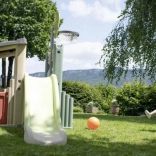 Das Häuschen mit Türchen bietet einen ruhigen Platz zum Ausruhen, Verstecken und für Rollenspiele – sicher im Schatten unter dem Dach.