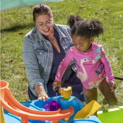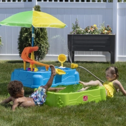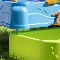 Der Wasserspieltisch 2-in-1 für Kinder bietet ein spannendes Outdoor-Spielerlebnis. Ausgestattet mit einem **großen Sonnenschirm, Booten, Katapulten** und einem **beweglichen Wasserauslauf** ist dieser Spieltisch ideal zum Wasserübergießen in den darunterliegenden Pool geeignet. **Der Pool kann nach dem Spielen platzsparend unter den Tisch geschoben werden.** Die obere Ebene fasst bis zu **15 Liter Wasser**, der Unterpool etwa **60 Liter**.