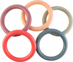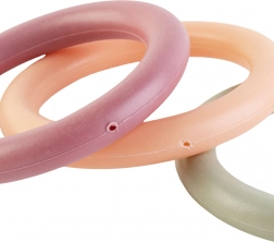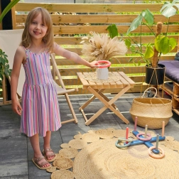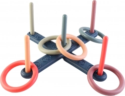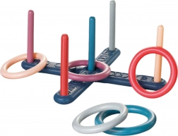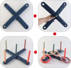 Kinder und Erwachsene trainieren ihre Motorik und Wurfgenauigkeit, indem sie Ringe auf Stangen werfen.