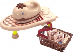Das Set enthält ein Bügelbrett, einen Wäschekorb, zwei Kleiderbügel und zwei Packungen Waschpulver für ein umfassendes Spielerlebnis.