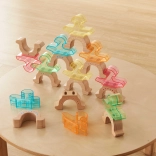 Transluzente Farbelemente in Kombination mit naturbelassenem Holz regen die Fantasie an. Die Figuren lassen sich zu Pyramiden, Zügen und originellen Formen stapeln.