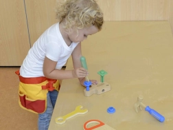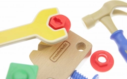 Hammer, Schraubenschlüssel, Schraubendreher, Schrauben und Dübel bestehen aus hochwertigem Holz, liegen gut in der Hand und sind ideal zum Üben der Feinmotorik.