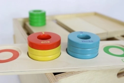 Das Aufstecken und Stapeln der Ringe auf Stifte trainiert den Griff, die Hand-Auge-Koordination und die Präzision der Bewegungen.
