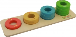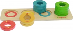Dieses hölzerne Lernset verbindet Spiel und Lernen. Kinder stecken bunte Ringe auf Stifte, sortieren sie nach Farbe und Anzahl und üben dabei das Zählen von eins bis vier. Jeder Ring ist mit einer Zahl und dem Wort auf Englisch beschriftet, was das Sprachverständnis ganz natürlich fördert.