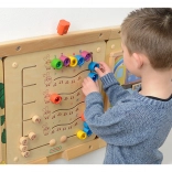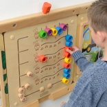 Eine Lernwandtafel mit fünf bunten Raupen für spielerisches Lernen von Zahlen und Mengen. Enthält 15 Diamant-Zählsteine in fünf Farben, die auf Schiebeschienen angebracht sind. Die Tafel ermöglicht Kindern eine interaktive Beteiligung und zeigt 5 Darstellungsarten der Zahlen von 1 bis 5: Ziffern, Finger, Striche, Blöcke und Punkte. Auf der linken Seite befinden sich Schieber, mit denen sich unterschiedliche Schwierigkeitsgrade einstellen lassen.