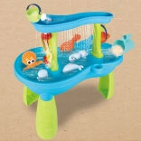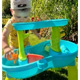 Kinder gießen Wasser in die obere Tischhälfte und beobachten den Fluss durch Wassermühlen und Löcher für einen unterhaltsamen Wassereffekt.