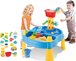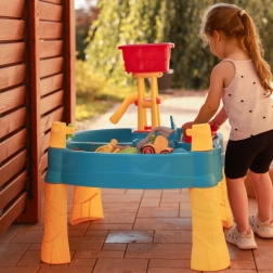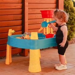 Die umfangreiche Ausstattung mit 14 Zubehörteilen (Förmchen, Gießkanne, Mühle, Schaufel, Harke, Auto und 2 Boote) fördert Fantasie, Hand-Auge-Koordination und das gemeinsame Spiel mehrerer Kinder. Dank der stabilen Kunststoffkonstruktion ist der Tisch für den Außen- und Innenbereich geeignet und leicht zu reinigen.