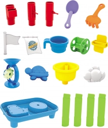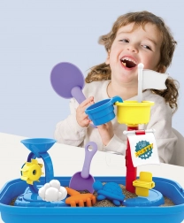 Enthält alle notwendigen Werkzeuge für kreatives Spiel mit Sand und Wasser - Förmchen, Rechen, Schaufeln und mehr.