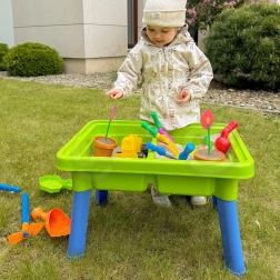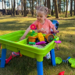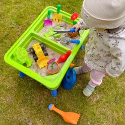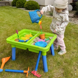 Entdecken Sie den vielseitigen 2-in-1-Spieltisch WOOPIE, der Wasserspaß und Sandkreativität in einem kompakten Set vereint. Zwei separate Fächer ermöglichen es, eines mit Wasser und das andere mit Sand zu füllen, sodass Kinder gleichzeitig schöpfen, umfüllen, sieben und formen können.