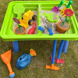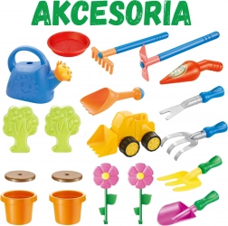 Die umfangreiche Ausstattung mit 13 Zubehörteilen (Gießkanne, Schaufeln, Harke, Förmchen, kleines Kipper-Auto, Blumentopf mit Blüte und mehr) regt die Vorstellungskraft an, fördert die Feinmotorik und eignet sich für selbstständiges wie gemeinsames Spiel. Ideal für Garten, Terrasse, Strand und Kinderzimmer.