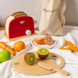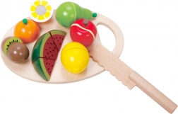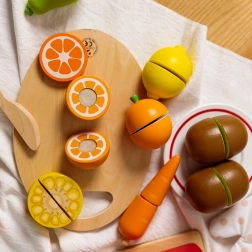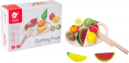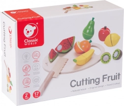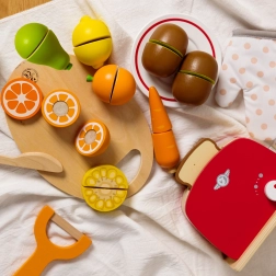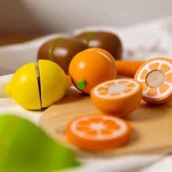 Das Holzset zum Obstschneiden von Classic World ist ein ausgezeichnetes Spielzeug für kleine Köche. Es enthält 17 Teile, die Kinder lehren, Obst auf einem speziellen Holzbrett zu schneiden. Die einzelnen Obststücke sind mit Klettverschluss verbunden, wodurch Kinder beim Schneiden einen Widerstand wie beim echten Schneiden spüren. Nach dem Schneiden kann das Obst leicht wieder zusammengefügt werden, und das Spiel kann von Neuem beginnen.