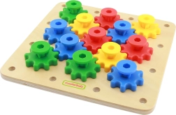 Die hölzerne Tafel hat Löcher, in die Stifte eingesetzt werden können, die die Zahnräder halten. Diese Zahnräder können in Reihen angeordnet werden, damit sie sich gegenseitig in Bewegung versetzen. Der Spaß ist sehr kreativ und wird die Kinder stundenlang fesseln.